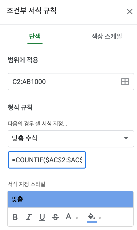 AC 열에 있는 항목이 C 열에 있을 경우 C~AB 열에 색깔 칠하는 스프레드 시트 조건부 서식 규칙.